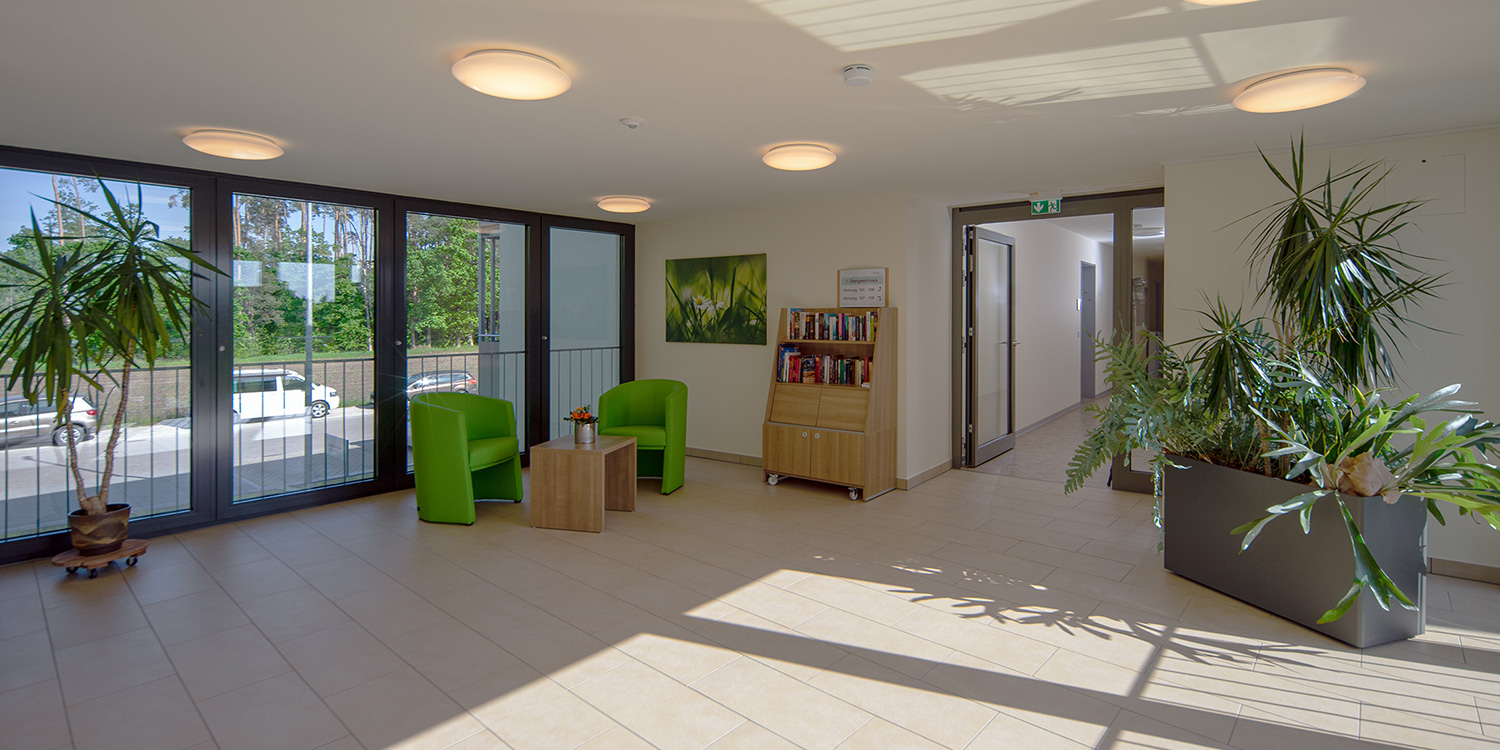 Aber auch die gemütlichen Sitzecken in den Fluren laden zum Verweilen, Lesen und zum Treffen mit Nachbarn ein. Zudem können der gemeinsame Rollstuhl- und Fahrradraum, sowie der Wäschetrocknungsraum von jedem Mieter genutzt werden.